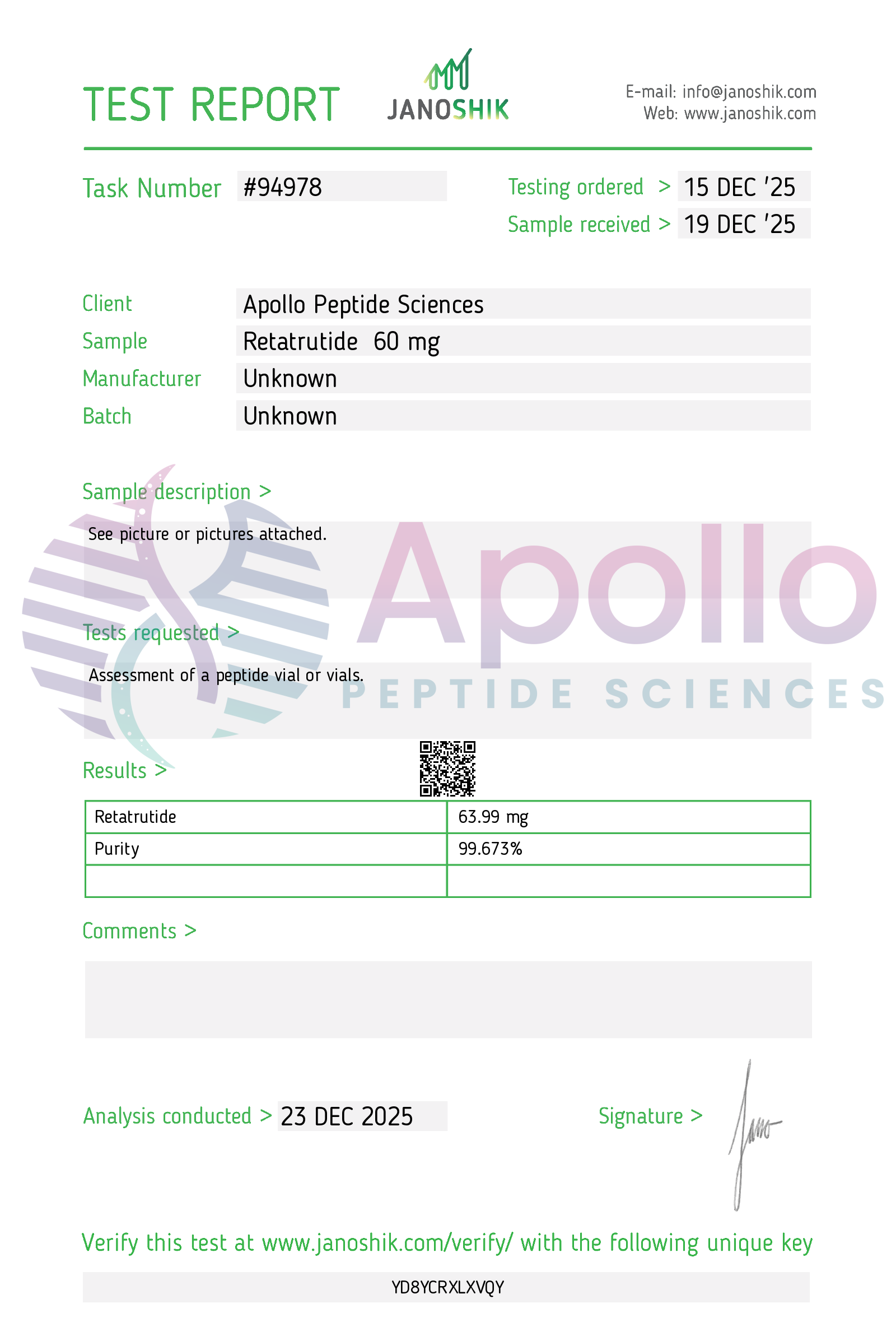 Retatrutide is a synthetic peptide analog incorporating structural modifications designed to enhance stability. It is supplied as a lyophilized powder intended for laboratory research use.